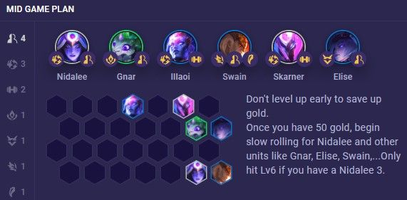 Sau khi có Nidalee 3 sao, chỉ nên nâng cấp lên cấp 6, sau đó thêm Elise và Swain để tạo đội hình Hóa Hình mạnh mẽ