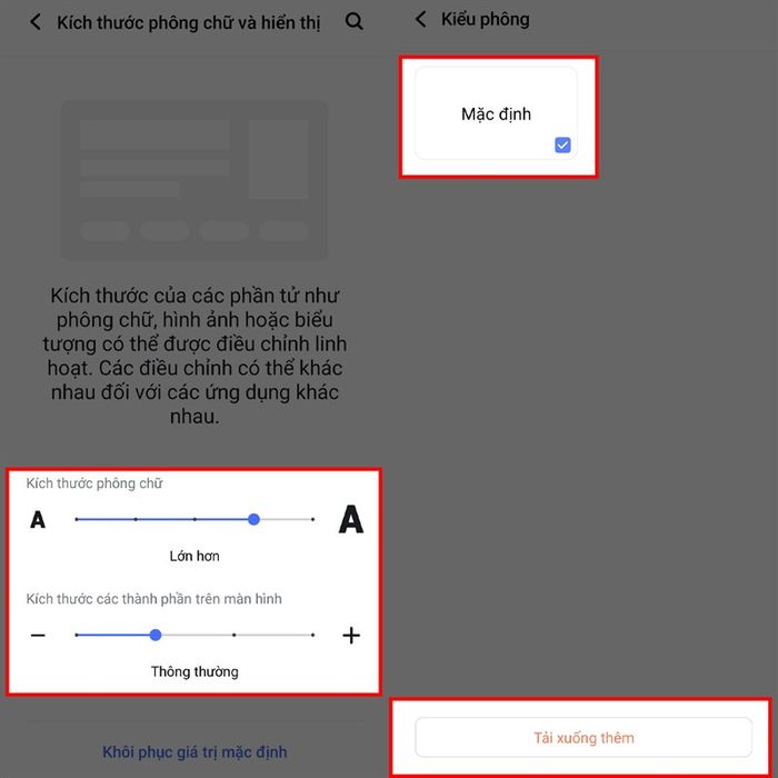 Bước 2: Để thay đổi kích thước chữ, kéo thanh màu xanh ở Kích thước phông chữ và Kích thước các thành phần trên màn hình về phía bên phải. Đối với thay đổi font, chọn Tải xuống thêm nếu bạn muốn sử dụng các font mới.