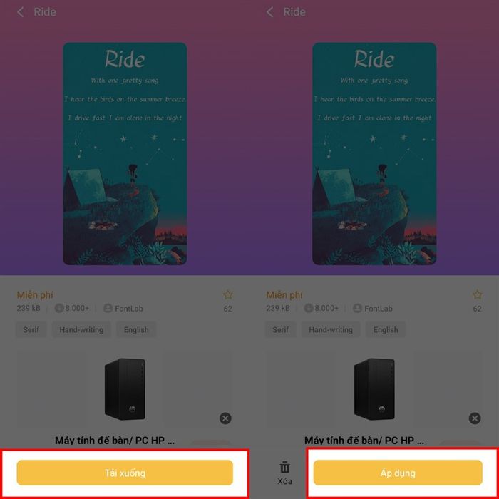 Bước 4: Chọn phông chữ ưa thích, nhấn Tải xuống và đợi chút để hoàn tất tải về. Khi tải xong, áp dụng ngay bằng cách nhấn Áp dụng. Font mới sẽ làm mới giao diện điện thoại của bạn ngay lập tức.