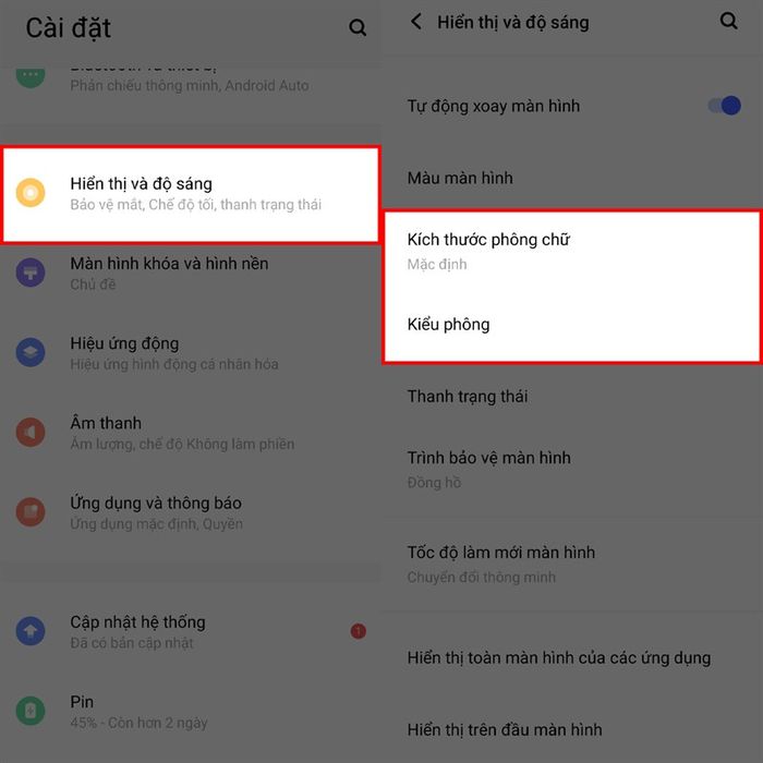 Bước 1: Truy cập Cài đặt > Hiển thị và độ sáng > Chọn Kích thước phông chữ để đổi kích thước và Kiểu font để thay đổi kiểu chữ.
