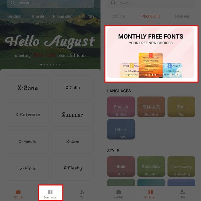 Bước 3: Trải nghiệm thế giới phông chữ trên điện thoại của bạn. Mở Phông chữ từ ứng dụng chủ đề, chọn Danh mục để khám phá đa dạng phông chữ. Duyệt qua banner để tìm thấy những phông chữ miễn phí hấp dẫn.