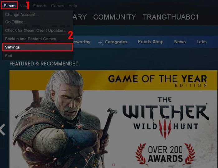 Bước 1: Đầu tiên tại giao diện chính của Steam bạn hãy chọn vào Steam và nhấn vào Settings.