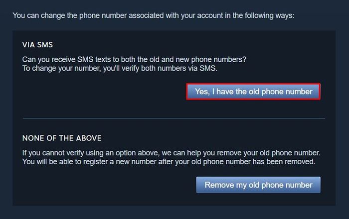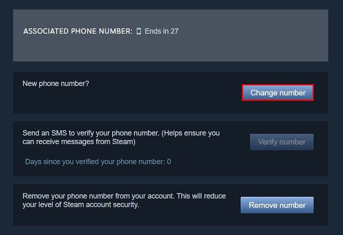 Tại màn hình chính Steam, chọn tên tài khoản > Nhấn Account Details > Đến mục Contact info và chọn Quản lý số điện thoại của bạn > Chọn Thay đổi số điện thoại > Vào mục Có, tôi có số điện thoại cũ > Nhập mã vừa được gửi về số điện thoại cũ của bạn > Chọn mã vùng Việt Nam > Nhập số điện thoại > Nhấn Tiếp theo > Vào email đăng ký Steam và mở thư mới được Steam gửi đến > Chọn vào Thêm số điện thoại > Nhấn Tiếp theo > Nhập mã xác nhận vừa được gửi về số điện thoại của bạn > Nhấn Tiếp theo > Nhấn Hoàn tất để kết thúc.