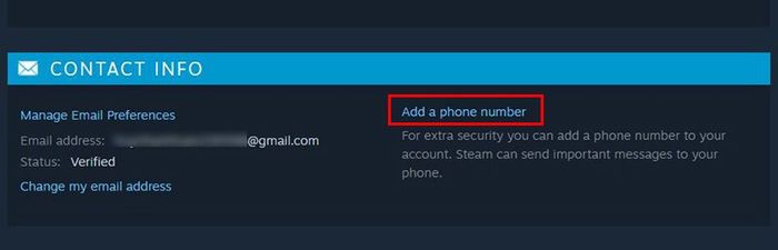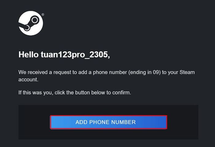 Bước 4: Tiếp theo, bạn truy cập email liên kết với Steam, mở email và chọn vào Add phone number.