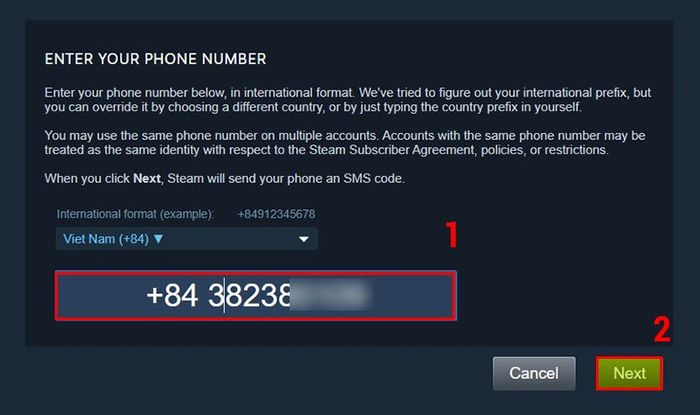 Chọn mã vùng Việt Nam, điền số điện thoại vào ô và nhấn Next.
