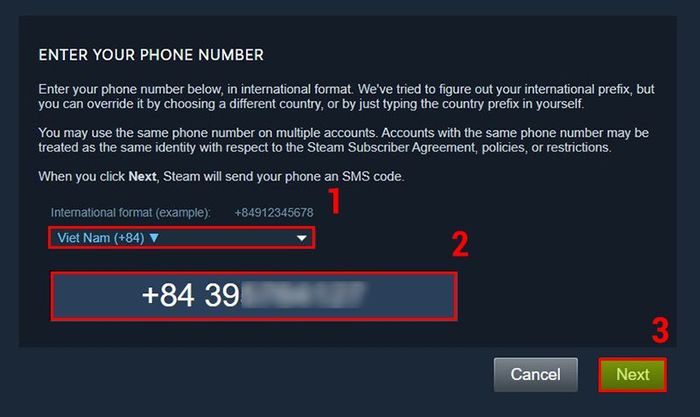 Bước 3: Chọn mã vùng Việt Nam, điền số điện thoại vào ô và nhấn Next.
