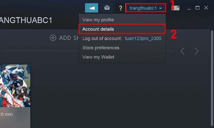 Đầu tiên tại giao diện chính của Steam, hãy chọn vào tên tài khoản của bạn và nhấn Account Details.