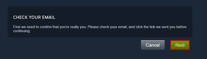 Bước 5: Quay trở lại giao diện Steam và nhấn Next để xác nhận đã kiểm tra Email.