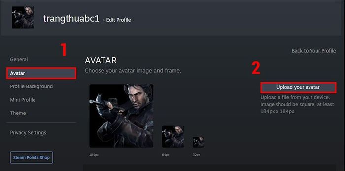 Tại màn hình chính Steam, chọn tên tài khoản > Nhấn Xem hồ sơ của tôi > Vào Chỉnh sửa hồ sơ > Chọn vào mục Ảnh đại diện > Nhấn vào Tải ảnh đại diện của bạn > Chọn hình ảnh muốn sử dụng làm ảnh đại diện > Nhấn Mở > Nhấn Lưu để lưu thay đổi ảnh đại diện.
