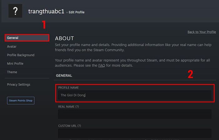 Trong giao diện chính của Steam, chọn tên tài khoản > Nhấn Xem hồ sơ của tôi > Vào Chỉnh sửa hồ sơ > Chọn vào mục Tổng quan > Thay đổi tên ở mục Tên hồ sơ > Di chuyển xuống dưới và nhấn Lưu để lưu thay đổi.