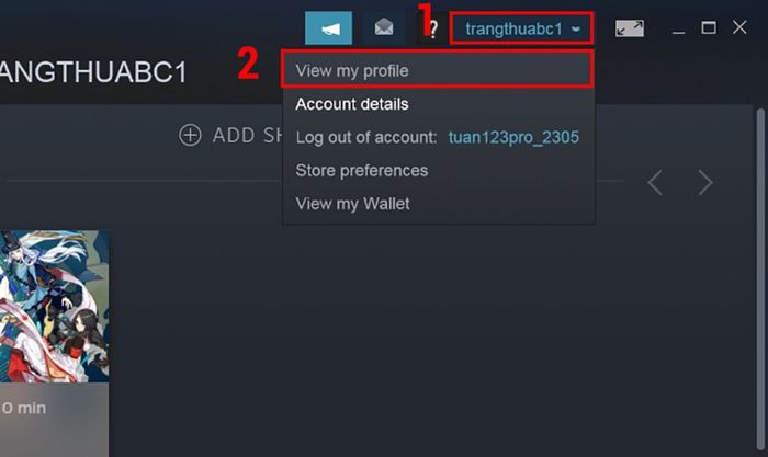 Bước 1: Tại giao diện chính của Steam, chọn vào tên tài khoản của bạn và nhấn Xem hồ sơ của tôi.