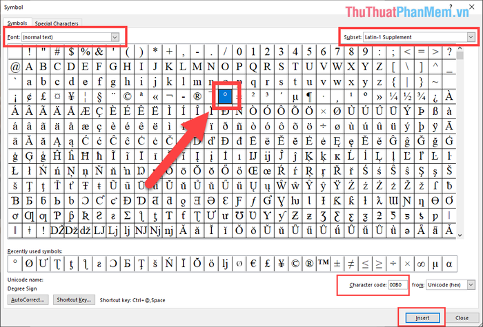 Bước 2: Tại đây, chọn Phông chữ: Văn bản Thông thường, Bộ ký tự: Bổ sung Latin-1 và nhập vào ô Mã ký tự: 00B0. Biểu tượng oC sẽ đổi màu xanh, nhấn Chèn để thêm.