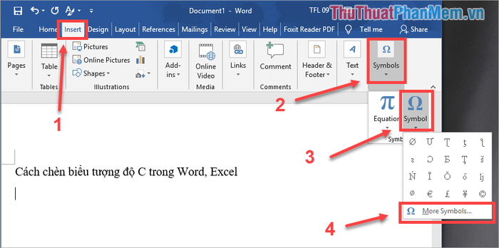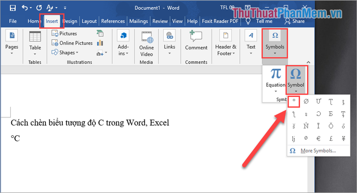 Bước 4: Để sử dụng biểu tượng oC trong các lần sau, chỉ cần chọn Chèn -> Ký hiệu -> Ký hiệu -> oC.