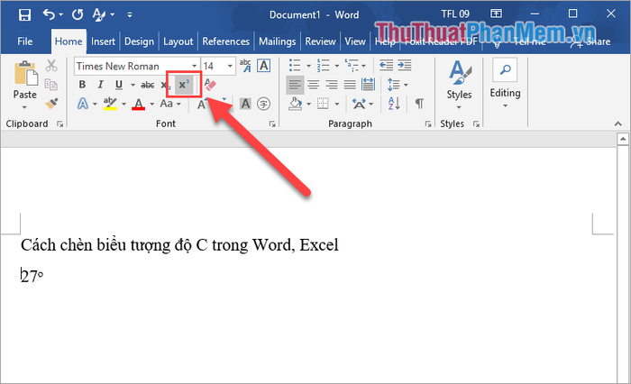 Bước thực hiện: Nhấn biểu tượng X2 trên thanh công cụ của Word. Sau đó, nhấn phím 'o' (chữ o) và thêm chữ C.
