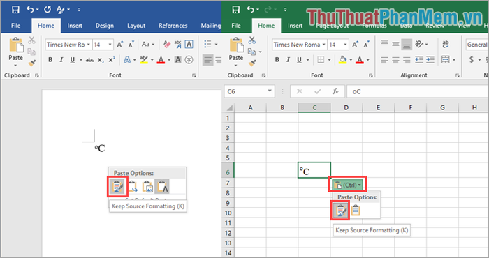 Nếu khi dán vào phần mềm mà biểu tượng không hiển thị đúng, Click vào Tùy chọn Dán và chọn Giữ Định dạng Nguồn (K) để hiện thị chính xác biểu tượng.