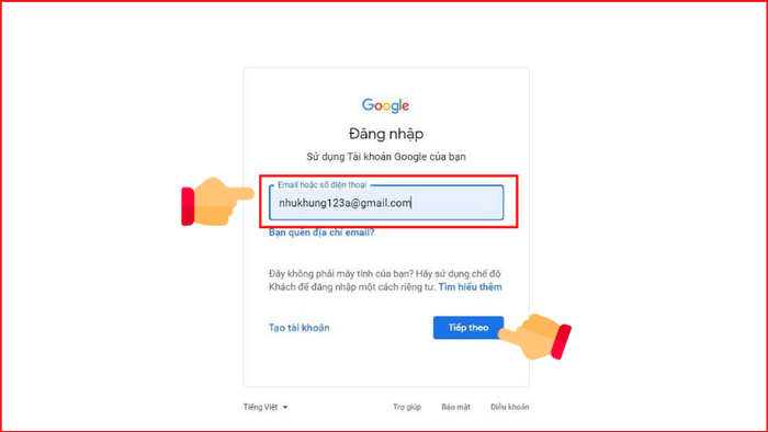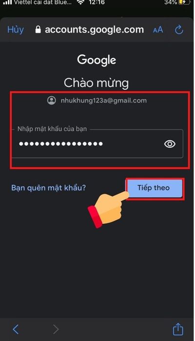 Bước 4: Nhập mật khẩu và địa chỉ Gmail > Chọn Tiếp theo.