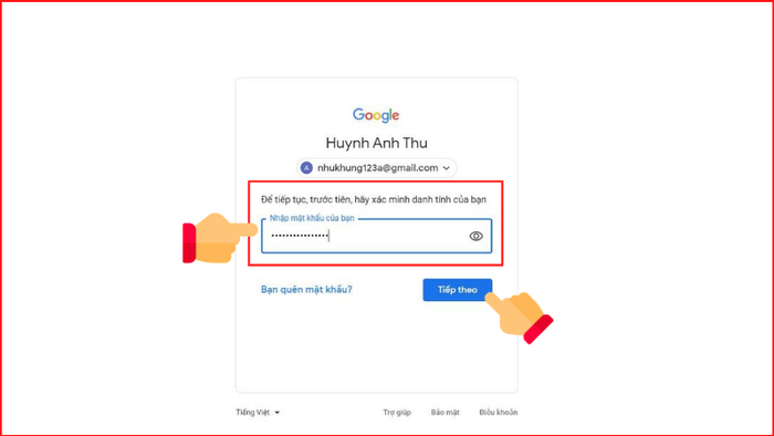 Bước 3: Điền mật khẩu và nhấn Tiếp theo để hoàn tất quá trình đăng nhập tài khoản mới.