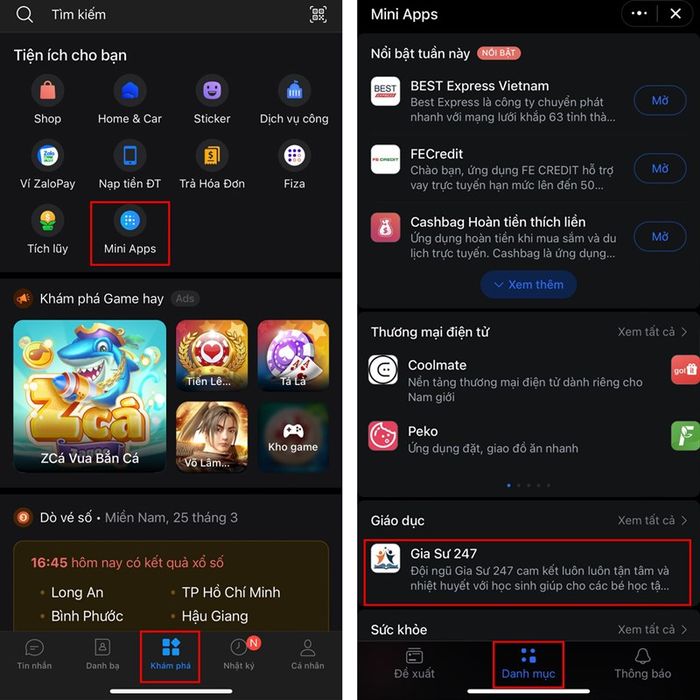 Bước 1: Truy cập Ứng dụng Zalo > Chọn Khám phá > Chọn Mini Apps > Chọn Danh mục > Chọn Gia sư 247.