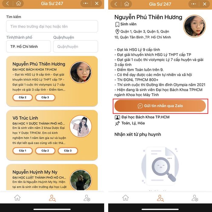 Bước 3: Tại đây, chọn Gia sư hiện có để tìm kiếm theo tỉnh, thành phố phù hợp nhất. Lựa chọn gia sư và nhấn gửi tin nhắn qua Zalo để trò chuyện chi tiết hơn. Ngoài ra, bạn có thể đăng ký làm gia sư hoặc tìm gia sư theo môn học, lớp học trong Gia sư 247.