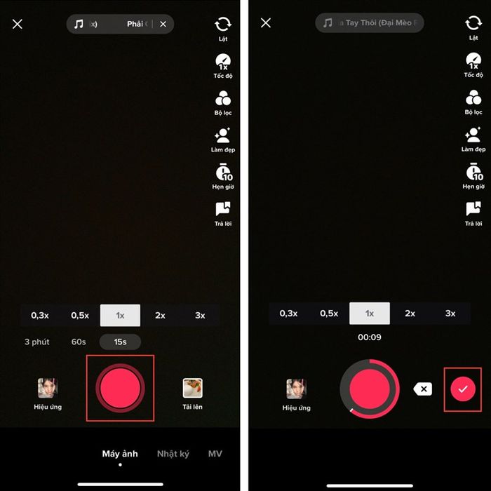 Bước 3: Sau khi cài đặt bộ lọc, quay video với bộ lọc đã chọn, nhấn biểu tượng tròn màu đỏ và nhấn biểu tượng đánh dấu tích để đăng video.