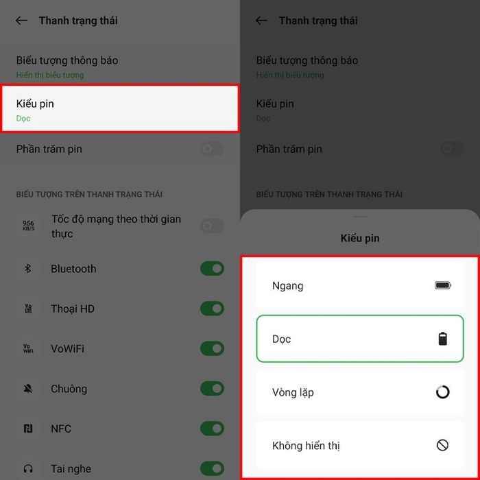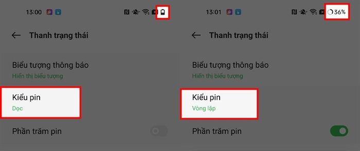 Bước 2: Tiếp theo, hãy chọn mục Kiểu pin và lựa chọn kiểu pin ưa thích. Có 3 kiểu để bạn lựa chọn: Dọc, Ngang và Vòng lặp. Hãy thử nghiệm và chọn kiểu phù hợp với phong cách của bạn. Bạn cũng có thể bật/tắt Phần trăm pin để theo dõi lượng pin còn lại một cách thuận tiện.
