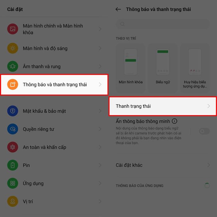 Bước 1: Nếu bạn là người sử dụng điện thoại OPPO, hãy để ý đến biểu tượng pin ở góc trên bên phải màn hình. Đó là vị trí quan trọng thuộc thanh trạng thái. Để tùy chỉnh biểu tượng pin, bạn chỉ cần vào Cài đặt > Thông báo và thanh trạng thái > Thanh trạng thái.