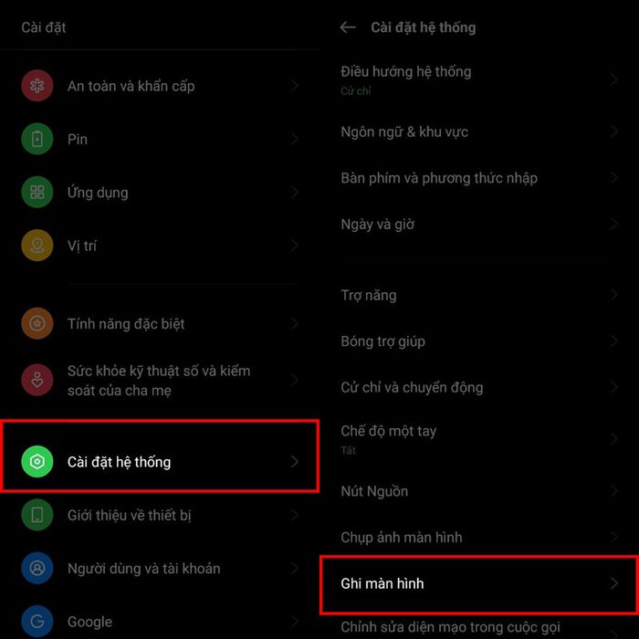 Bước 1: Truy cập Cài Đặt > Cài Đặt Hệ Thống > Ghi Màn Hình trên điện thoại OPPO.
