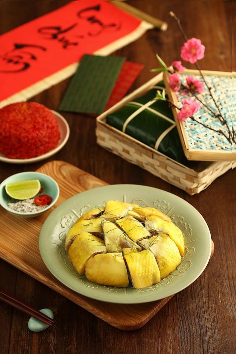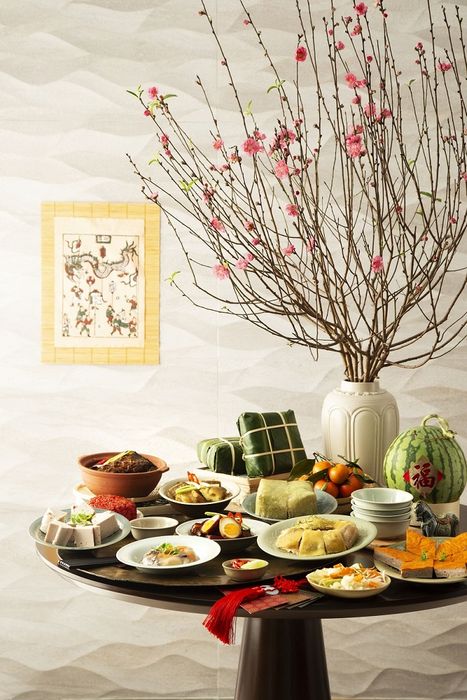 Bàn thờ gia tiên thường trang trí với các món đặc trưng như bánh chưng, bánh tét, cùng với mâm ngũ quả và hoa tươi tạo không khí Tết. Hoa dơn, hoa cúc, hoa ly hoặc hoa đào đều rất thích hợp cho trang trí này.