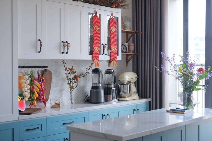 Gian bếp được coi là nơi duy trì lửa cho ngôi nhà, vì vậy cần được dọn dẹp sạch sẽ và gọn gàng trong những ngày Tết. Để làm cho gian bếp tươi sáng, bạn có thể trang trí một số bông đào, mai hoặc dán những bức tranh tường. Nhiều người còn nâng cấp gian bếp bằng cách sơn lại tường để tạo môi trường sạch sẽ và sáng sủa. Trang trí gian bếp giúp chuẩn bị các món ngon trong ngày Tết trở nên dễ dàng và gọn gàng, cũng tạo không khí ấm cúng và đoàn viên cho gia đình.
