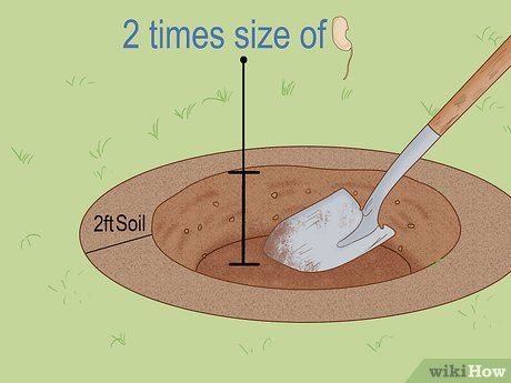 Đào hố trồng cây. Sử dụng xẻng đào hố đất rộng gấp đôi hoặc bốn lần bầu rễ cây. Nếu có cỏ mọc xung quanh, nhổ cỏ trong vòng 60 cm xung quanh hố đất. Trộn đất với một ít phân trộn và lấp lại xung quanh cây.