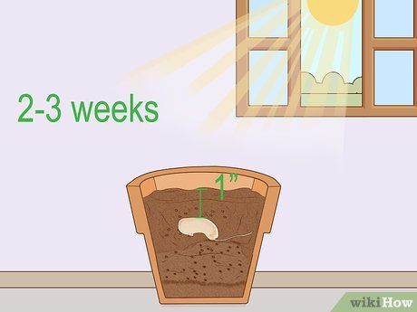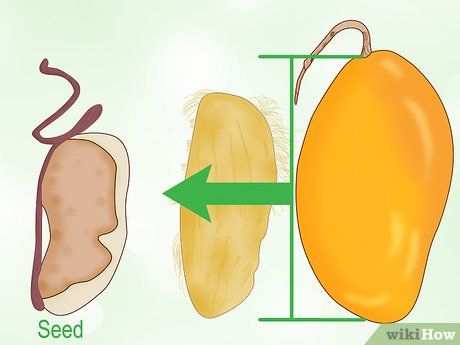 Gieo hạt. Đặt hạt xoài vào đất khoảng 2,5 cm, mặt lõm hướng xuống. Tưới nước vào đất và đặt khay trong môi trường ấm, râm mát cho đến khi hạt nảy mầm. Quá trình này thường mất từ 1-3 tuần.