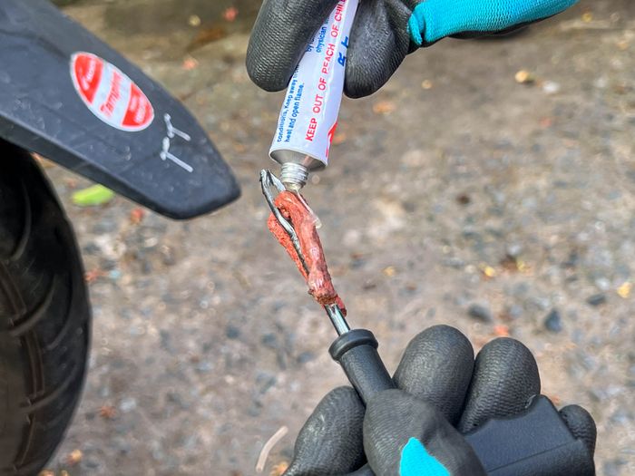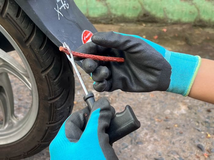 Do tay cầm của cây dùi nhỏ và thô, việc ấn, đẩy đòi hỏi phải sử dụng nhiều lực. Đề phòng bị cấn và đau lòng bàn tay, nên đeo bao tay vải khi thực hiện.Bước 3: Chuẩn bị cao su để vá lỗ