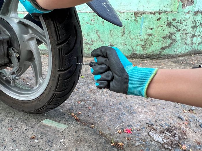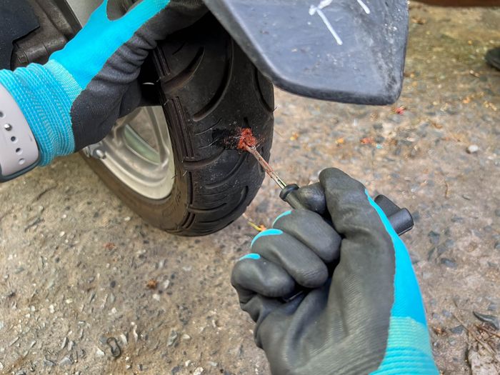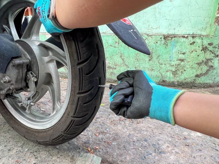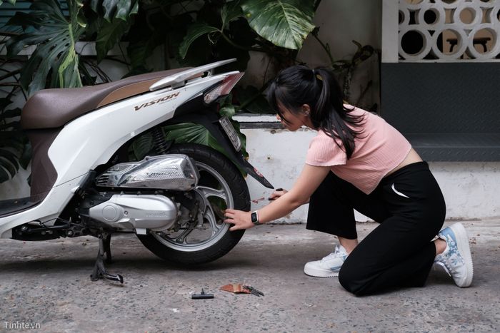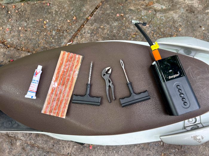 Chiếc bánh xe sau của xe Vision đang sử dụng của mình bị đâm lỗ to, không thể bơm lên được. Tôi đã thử tự vá bánh xe với bộ dụng cụ vá lỗ có giá khoảng 50 nghìn, mà bạn có thể dễ dàng tìm thấy trên các trang mua sắm trực tuyến.Danh sách dụng cụ cần thiết để tự sửa bánh xe