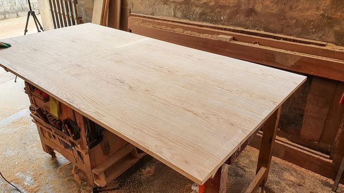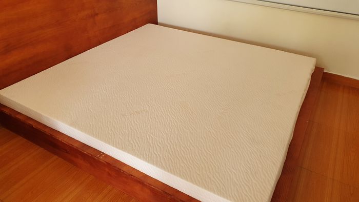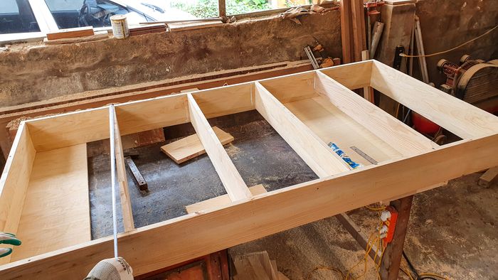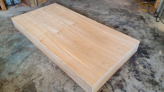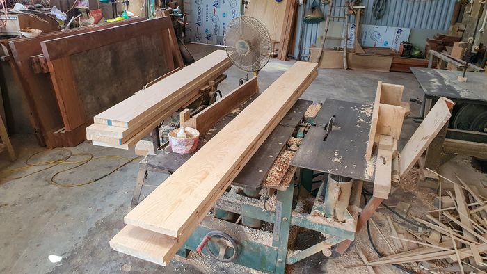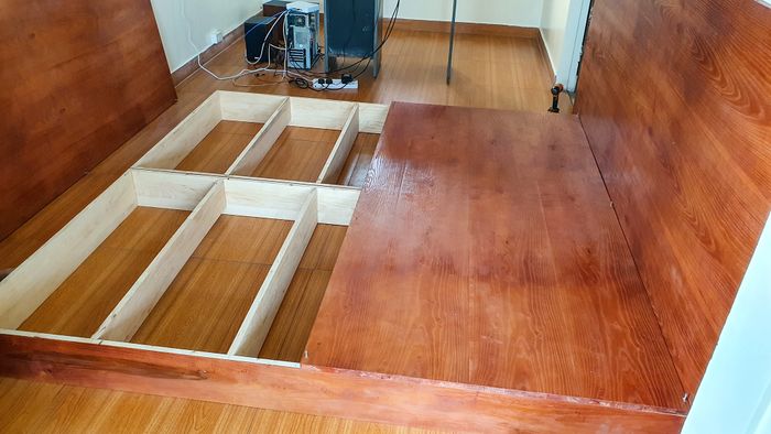 Các miếng gỗ thừa sau khi được cắt sẽ được kỳ công bắt vào nhau để tạo nên một chiếc giường vững chãi. Tôi đã tạo ra hai chiếc phản thế này với kích thước tổng cộng là 2.1m x 2.1m.