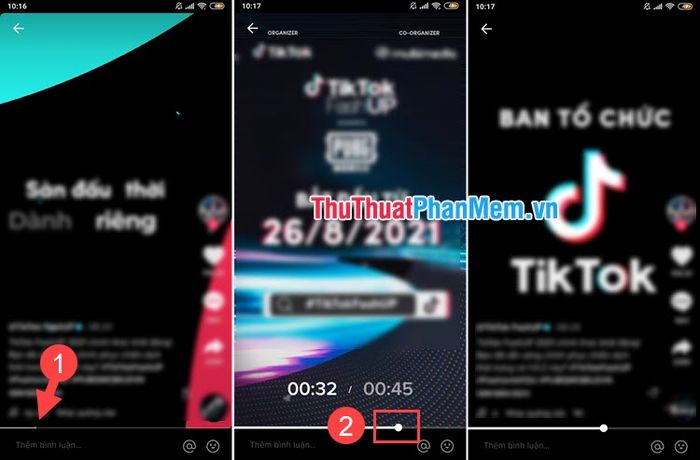 Với video hỗ trợ tua, bạn sẽ thấy một chấm tròn nhỏ ở phía trên mục Bình luận. Hãy chạm vào chấm tròn đó (1) và di chuyển nó sang trái để tua lại hoặc sang phải để tua nhanh đến đoạn video cần xem.