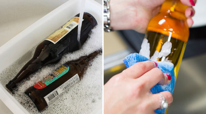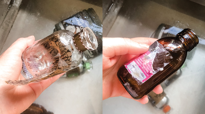 - Bước 3: Sử dụng miếng khăn mềm, xốp để chà nhẹ, nhìn thấy nhãn dán bong ra. Rửa sạch, để ráo chai lọ để sử dụng.