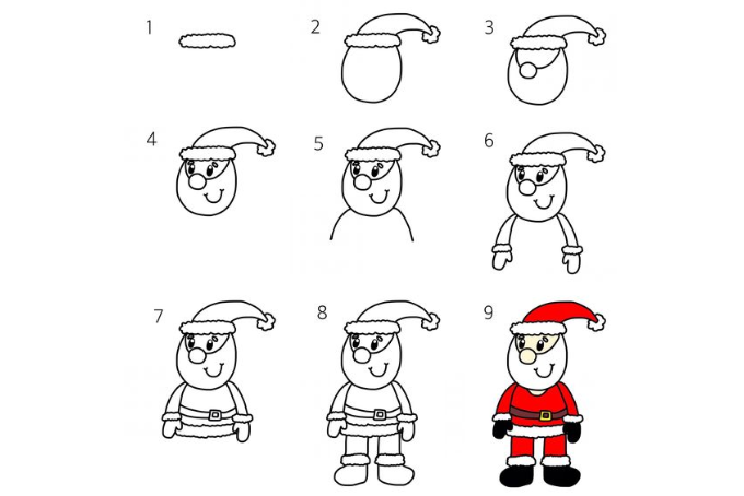 Bắt đầu bằng việc vẽ mũ có lông ở đỉnh và làm các góc cạnh trở nên mềm mại, tạo nên hình ảnh ông già Noel phúc hậu.