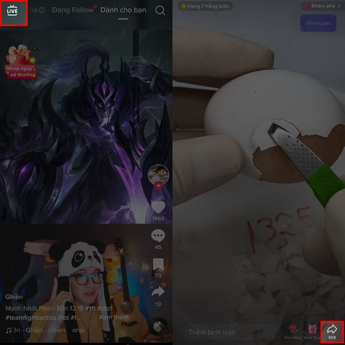 Bước 2: Sau khi cập nhật ứng dụng thành công, bạn hãy khởi động ứng dụng TikTok. Để xem các video trực tiếp, hãy nhấn vào biểu tượng Live ở góc trên bên phải màn hình. Mỗi video trực tiếp sẽ có một nút chia sẻ ở góc dưới bên phải màn hình, hãy nhấn vào đó .