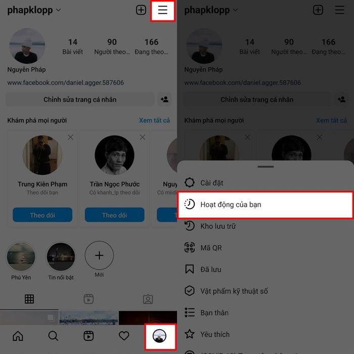 Bước 1: Mở ứng dụng Instagram và chạm vào hình đại diện của bạn ở góc dưới cùng bên phải để vào trang cá nhân. Tiếp theo, chạm vào biểu tượng menu 3 gạch ngang ở góc trên bên phải và chọn Hoạt động của bạn.