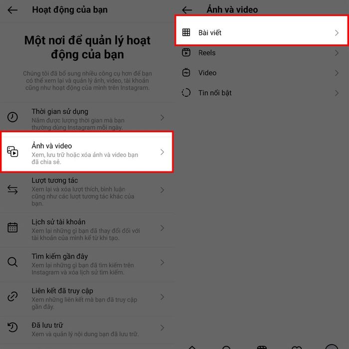 Bước 2: Chọn mục Ảnh và video > Bài viết để xem và quản lý bài đăng của bạn trên trang cá nhân.