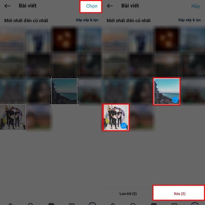 Bước 3: Khi đã chọn bức ảnh và bài viết cần xoá, hãy nhấn nút Chọn ở góc trên bên phải. Tiếp theo, chọn các nội dung muốn loại bỏ. Sau khi hoàn tất, chỉ cần nhấn Xóa. Một thông báo xác nhận sẽ hiện ra, chỉ cần xác nhận xóa một lần nữa là xong.