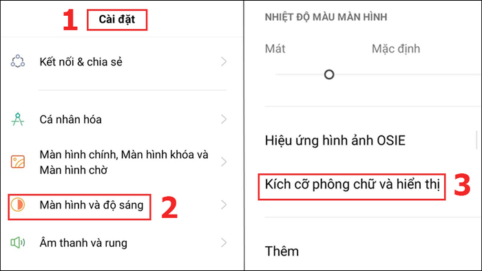- Bước 1: Mở Cài đặt > Chọn Màn hình và độ sáng > Nhấn vào Kích cỡ phông chữ và hiển thị.