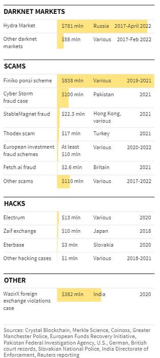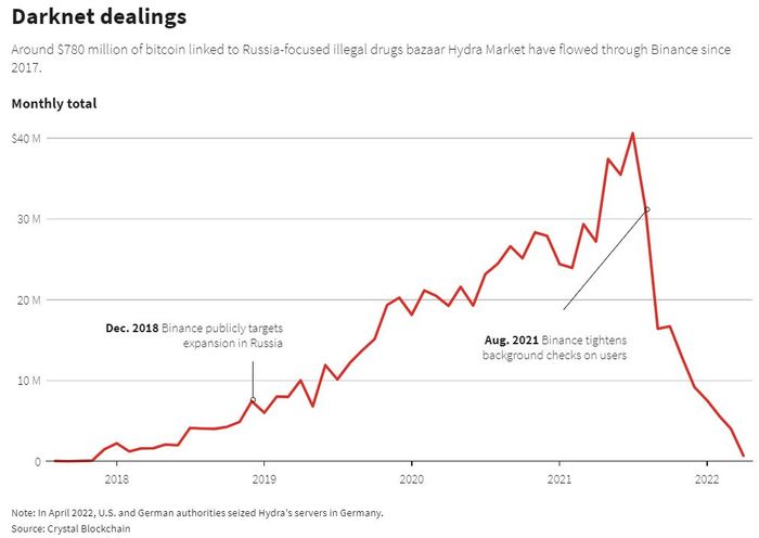 Reuters cho biết từ năm 2017 đến 2021, Binance đã xử lý hơn 2,35 tỷ USD giao dịch tiền bẩn liên quan đến các vụ tấn công mạng, lừa đảo và buôn bán chất cấm thông qua các “chợ đen” như Hydra.