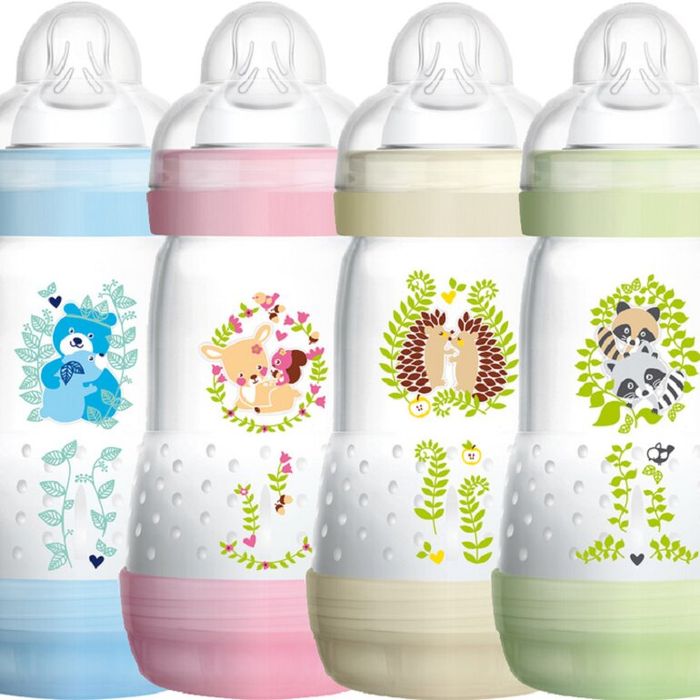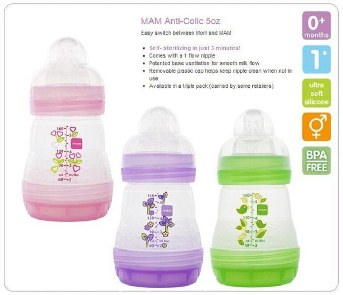 Bình sữa Mam có 3 dung tích khác nhau và nhiều màu sắc để mẹ có thể chọn lựa cho bé yêu.