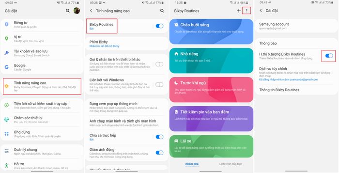 - 22h: đi ngủ. Bật chế độ Máy bay (Airplane mode), mở bài hát êm dịu khoảng 15 phút trước khi ngủ. Chuyển thiết bị sang chế độ tiết kiệm pin tối đa.Đi tới > Cài đặt > Tính năng cao > Bixby Routines3 chấm > Cài đặt > Hiển thị biểu tượng Bixby Routines