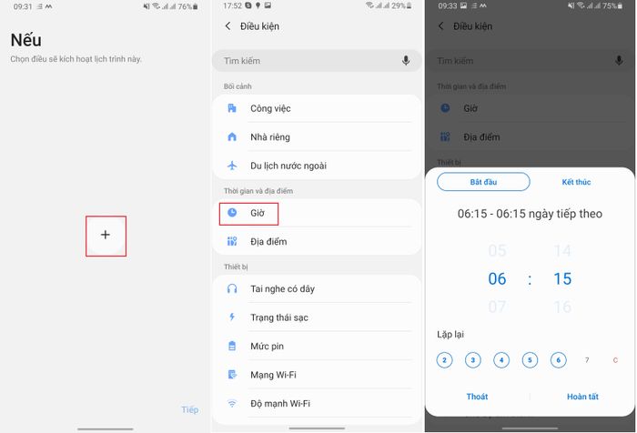 Sau khi đã đặt điều kiện là thời gian bắt đầu và kết thúc, nhấn nút 'Tiếp tục' để thiết lập 'Thao tác'. Đây là nơi bạn có thể thiết lập các 'Hành động' ứng với thời gian đó. Dưới đây là một số hành động mẫu bạn có thể chọn: