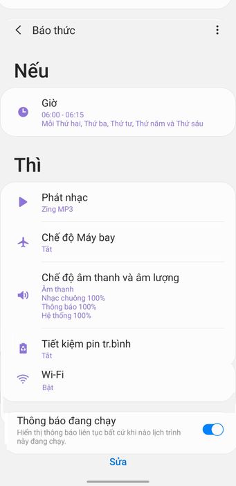 - 6h00: Đặt báo thức để tập thể dục trong 15 phút, nghe nhạc yêu thích. Tắt chế độ Máy bay, bật wifi để nhận thông báo. Chuyển âm thanh điện thoại sang chế độ bình thường (nếu đang ở chế độ rung). Chuyển chế độ pin sang chế độ bình thường.