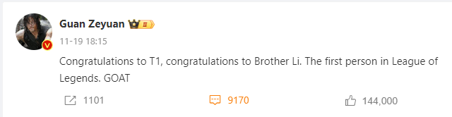 T1 đã có một hành trình ấn tượng để giành chức vô địch CKTG 2023Do đó, Faker và đồng đội đã nhận được nhiều lời khen ngợi và chúc mừng từ các chuyên gia, BLV trên toàn thế giới. Ngay cả trong khu vực của LPL, BLV danh tiếng Quản Trạch Nguyên cũng đã viết bài ca ngợi T1 và Faker. Tuy nhiên, điều đáng lưu ý là có nhiều fan LPL phản đối dữ dội hành động này, và đã quay sang chỉ trích BLV Quản Trạch Nguyên.