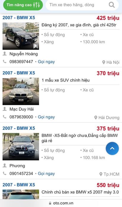 Khám phá thị trường ô tô trực tuyến, BMW X5 2007 nổi bật với mức giá 370 - 550 triệu đồng. Sau 15 năm, giá trị của chiếc xe không thua kém so với những dòng xe phổ thông. Có xe chỉ 300 triệu đồng - cạnh tranh với giá xe mới tại các đại lý.