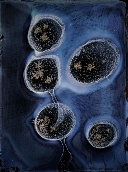 Với lĩnh vực của Koerner, điều này hợp lý: Anh là giáo sư hóa học hữu cơ có kinh nghiệm chuyên nghiệp làm việc tại các công ty khởi nghiệp hóa học. Giống như bất kỳ nhà khoa học nào, anh biết rằng việc tạo ra loại hình ảnh mà anh muốn sẽ đòi hỏi một số thử nghiệm. Koerner đầu tiên thử trồng nấm trên đĩa Petri để tạo ra mẫu hình fractal mong muốn bằng giấy ảnh hết hạn từ những năm 1930 và 1940, vào thời điểm mẹ anh sống ở Nhật Bản. Anh thấy quá trình quá khó khăn và thay vào đó bắt đầu xem xét một giải pháp hóa học phù hợp hơn với công việc hàng ngày của mình. "Tôi làm việc một cách kiên trì, mỗi ngày, mỗi đêm, trong nhiều tháng liền mà vẫn không đạt được những gì tôi muốn," Koerner nhớ lại. "Sau đó, tôi cuối cùng nhận ra, ôi, tôi không sử dụng nguyên lý khoa học của mình. Đó là vấn đề về động học: Phản ứng này phải diễn ra nhanh hơn. Vì vậy, tôi phải sử dụng phiên bản tập trung hơn."